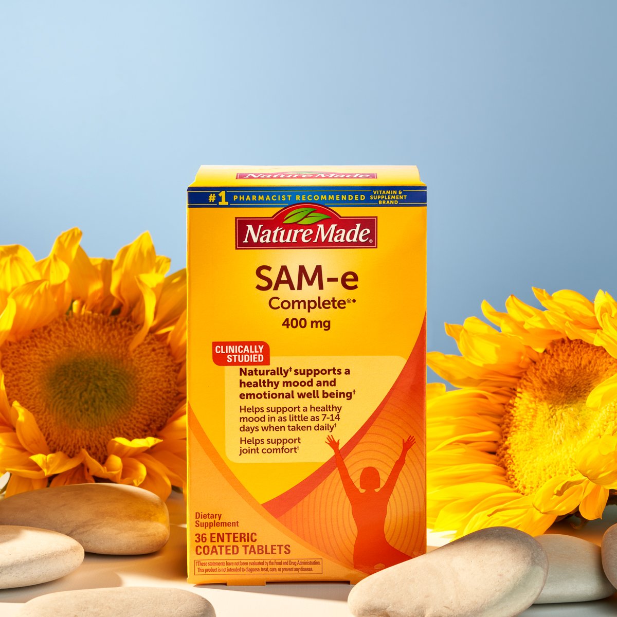 A healthy mood sets the tone for your whole day. SAM-e is a molecule made in the cells of our bodies. However, SAM-e levels can run low due to various factors such as diet and aging. Nature Made® SAM-e Complete®◆ can help to replenish your SAM-e levels and restore your healthy mood in as little as 7–14 days when taken daily. Nature Made® SAM-e also helps support joint comfort, which may naturally deteriorate with physical activity and age. SAM-e provides a source of sulfur, which is a critical component of joint tissue. It's now that much easier to stay on top of your health.†