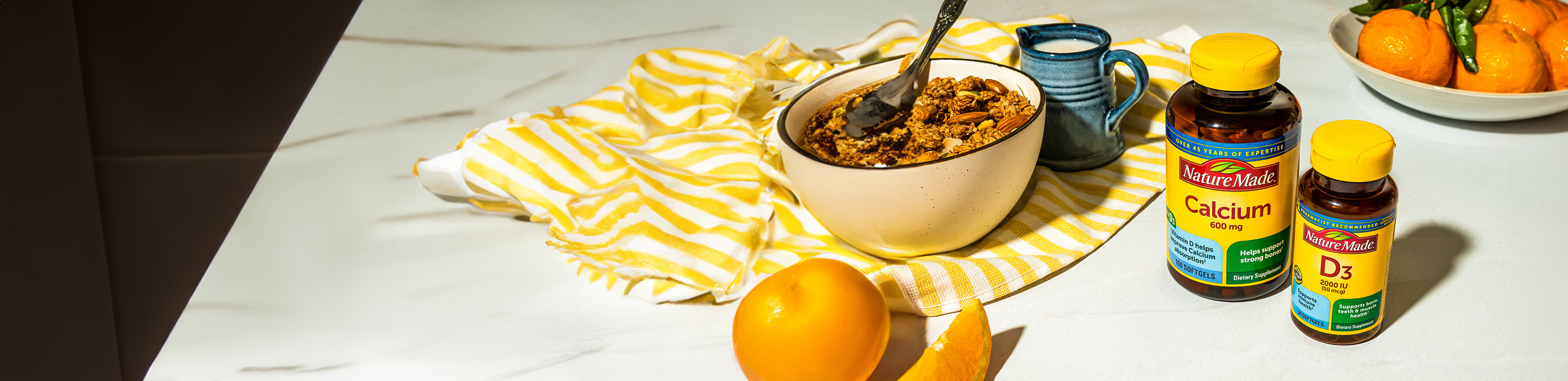 Having adequate calcium and vitamin D in your already healthy diet, along with regular physical activity, may reduce the risk of osteoporosis later in life. Calcium and vitamin D work synergistically because vitamin D helps your body effectively absorb calcium. Calcium and vitamin D supplements can help with bone strength, and Vitamin D also helps support muscle and immune health.†