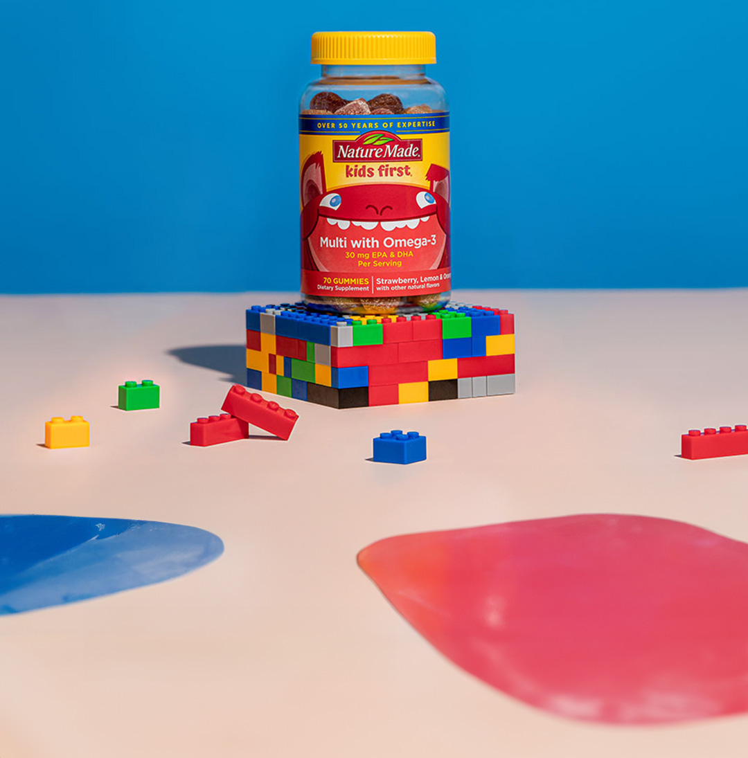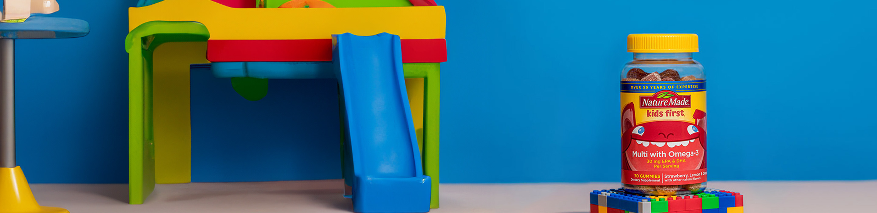 Nature Made® Kids First® Multivitamins are specially formulated for kids ages 4–18 with essential nutrients that many kids fall short of in their daily diet, such as Vitamins A, C, D and E and the mineral Zinc.[1]