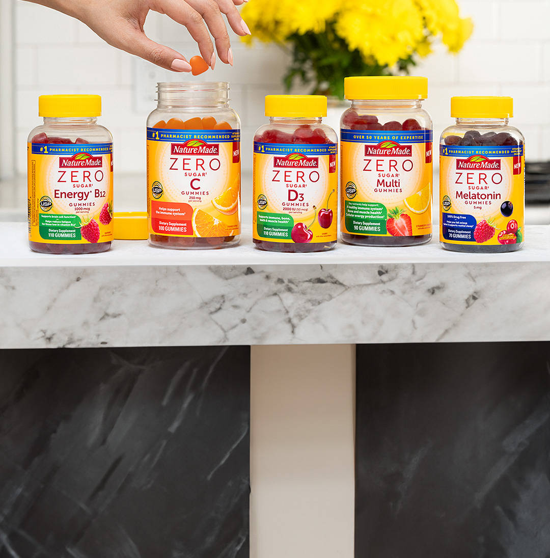 Love to take gummy vitamins but don’t love the sugar? Try our new line of sugar free gummies. Nature Made® Zero Sugar Gummies‡ provide the same benefit as our regular gummies but with zero grams of sugar per serving.‡ And they taste just as great, too!†
