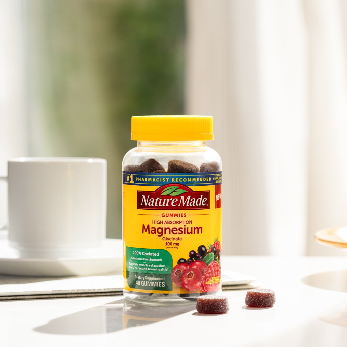 Magnesium is a multifaceted mineral with many roles in the body. It supports essential nerve, muscle and heart function, helps convert food into cellular energy, and helps relax the body. Nature Made® High Absorption Magnesium Glycinate Gummies, 100 mg of Magnesium per serving, is chelated and has better absorption and GI tolerance than other forms of Magnesium supplements such as Magnesium Oxide. And it tastes great!†