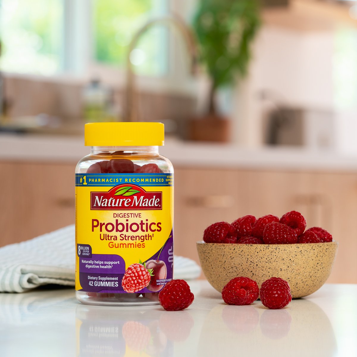 A healthy digestive tract is important for overall health and wellness. Nature Made® Digestive Probiotics Ultra Strength‡ Gummies help support digestive health. Formulated to provide at least 8 billion live cells per 2 daily gummies.◆ Made with natural fruit flavors and colors derived from natural sources. When you keep your gut happy, it'll keep you happy too.†